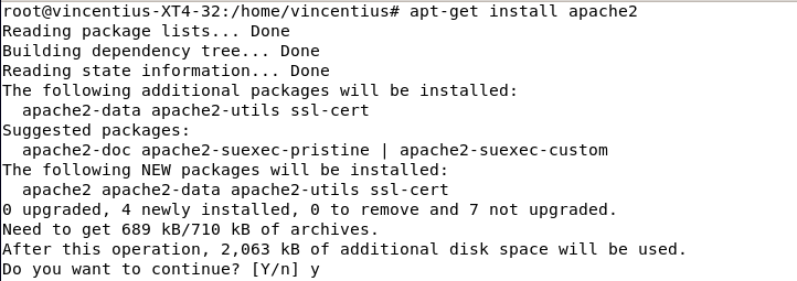 Install apache2 dengan perintah 'apt-get install apache2'. Apache adalah software web server gratis dan open source yang memungkinkan penggunanya untuk mengupoad website ke internet
