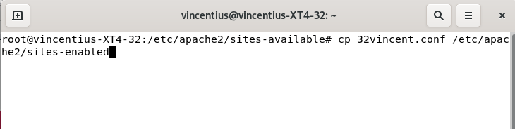 Copy file konfigurasi ke folder sites-enabled dengan perintah 'cp "namakalian". conf/etc/apache2/sites-enabled'.