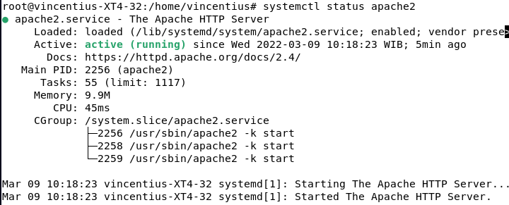 Setelah kalian berhasil mendownload apache2 lihat status apache2 cek status apache2 dengan perintah 'systemctl status apache2'. Pastikan apache2 dalam keadaan aktif.
