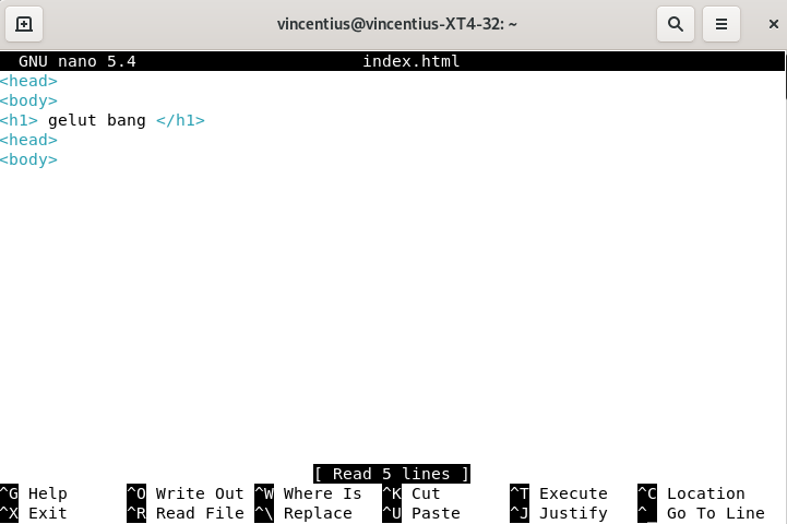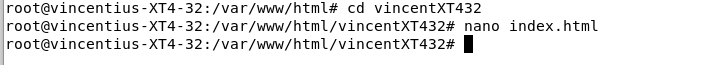 Masuk ke folder yang kalian buat dengan perintah 'cd "namafolder"'. Lalu buat file "index.html baru dengan perintah 'nano index.html'