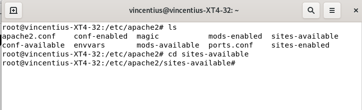 Jika kalian sudah masuk ke dalam folder apache2 coba kalian lihat list isi folder dengan perintah 'ls'. Di dalam apache2 kalian akan menemukan folder sites-available pergilah menuju kesana dengan perintah 'cd sites-available'